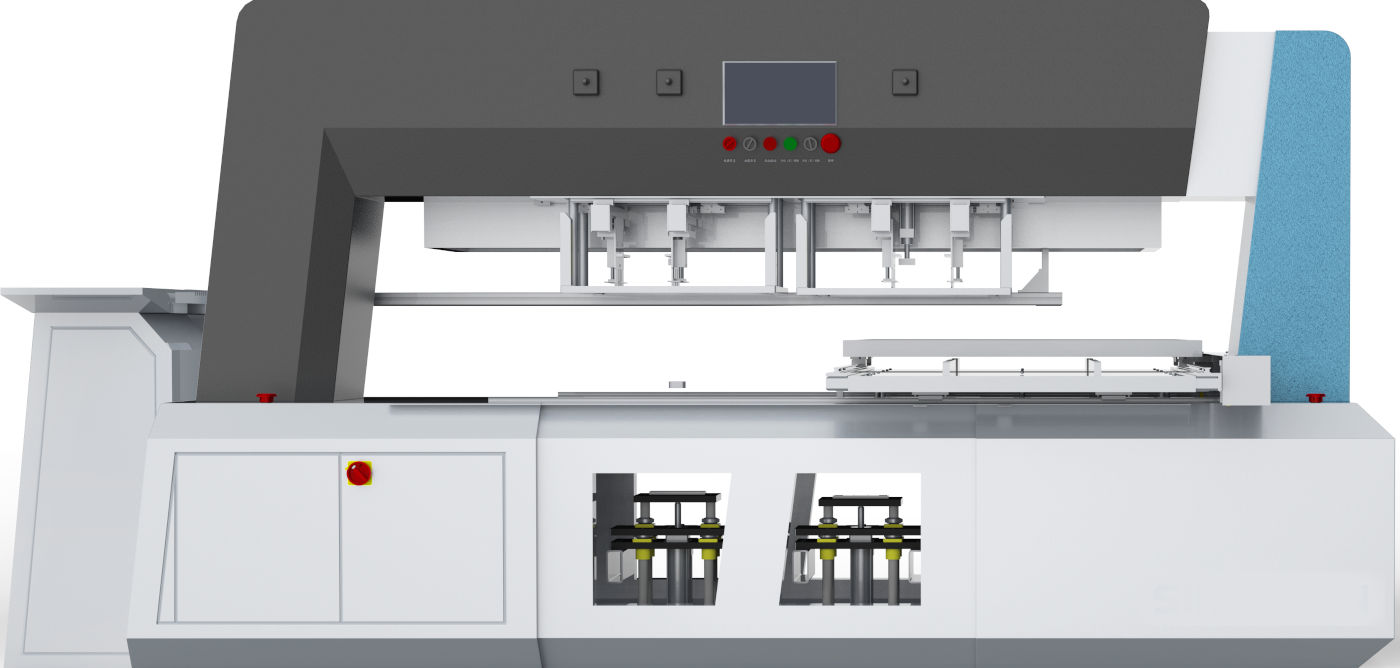 Também opcionalmente, o equipamento pode contar com um terceiro cabeçote (puncionador) para trabalhos com janelas ou perfurações, permitindo o esvaziamento e a saída do produto já finalizado.